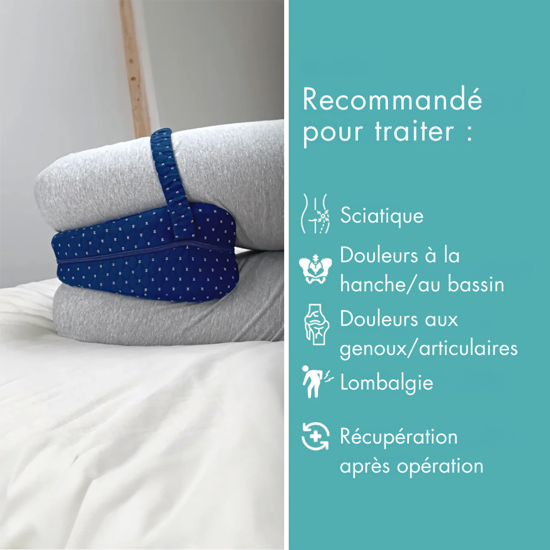 Placez simplement le coussin Alignia™ entre vos jambes en dormant sur le côté. Il s’ajuste naturellement pour soutenir vos hanches et votre colonne vertébrale.