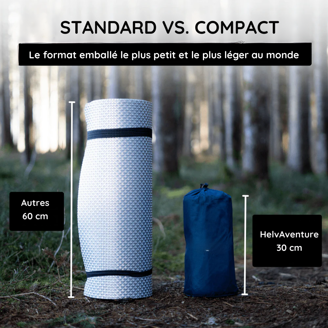 Grâce à son épaisseur généreuse de 10 cm, HelvAventure™ t’offre un soutien exceptionnel et un confort inégalé, même sur les surfaces les plus dures ou accidentées. Fini les nuits agitées à cause des cailloux ou des irrégularités du sol — chaque nuit en plein air devient un vrai moment de récupération.