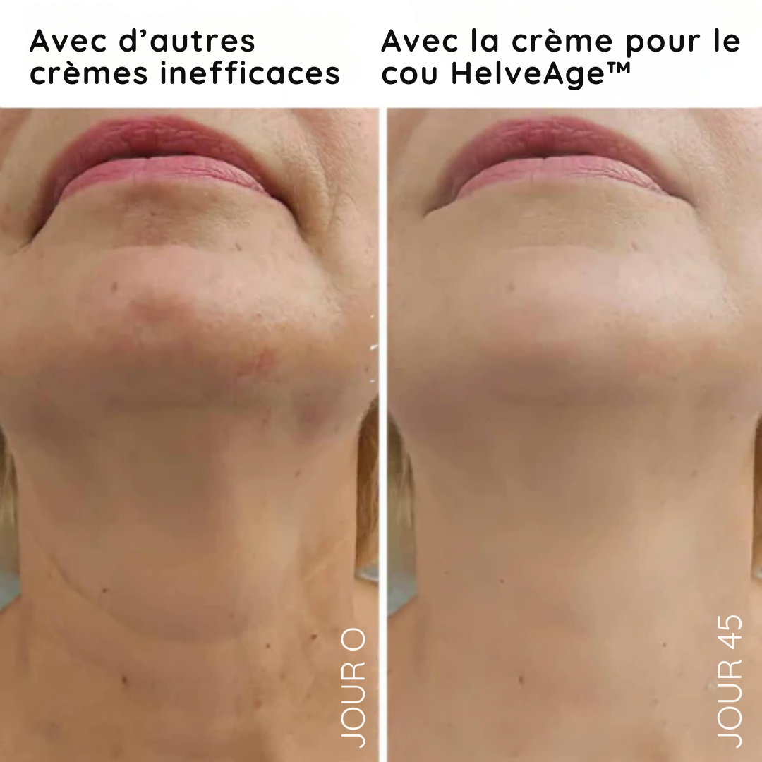 La peau du cou est plus fine, plus fragile et souvent négligée dans les routines de soins. C’est pourquoi HelveAge™ a été spécialement formulée pour agir là où les autres crèmes échouent. Grâce à sa formule raffermissante multidimensionnelle, elle pénètre en profondeur, stimule la production de collagène, et améliore l’élasticité de la peau jour après jour. Résultat : un cou visiblement plus tonique, hydraté et rajeuni.