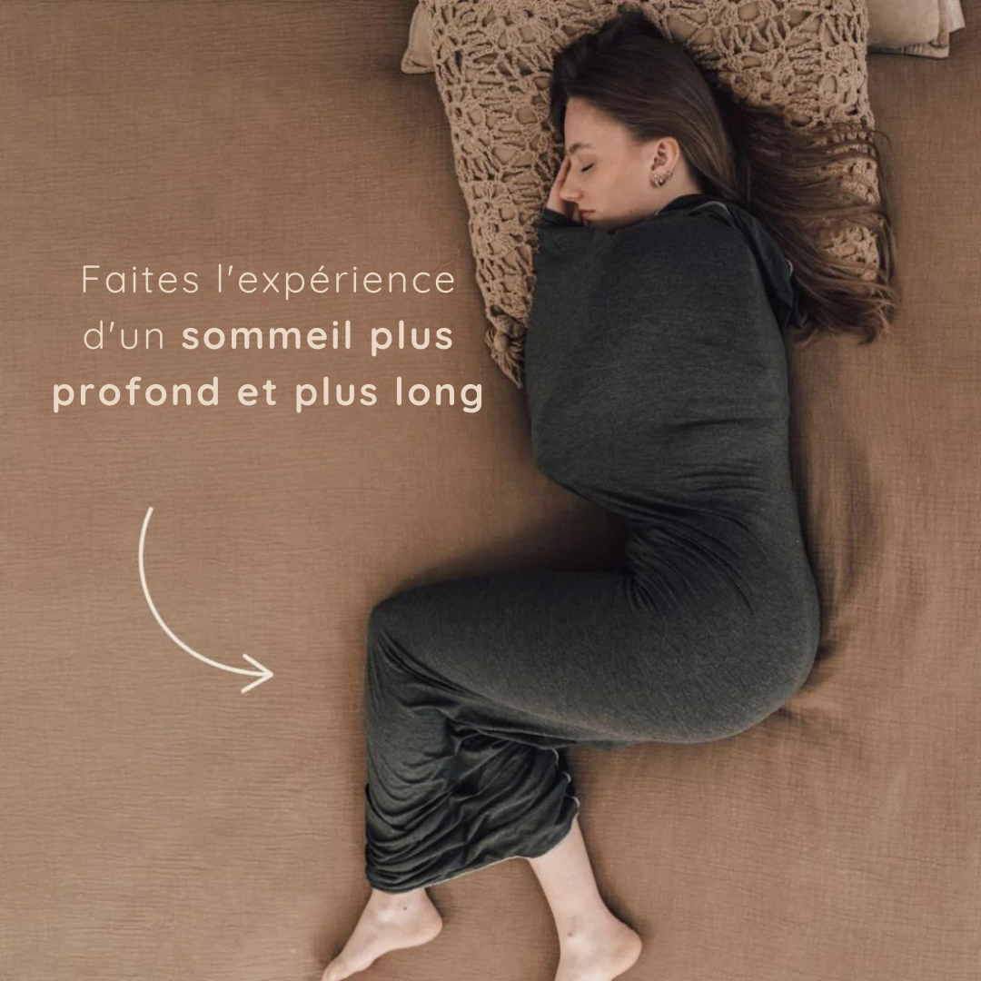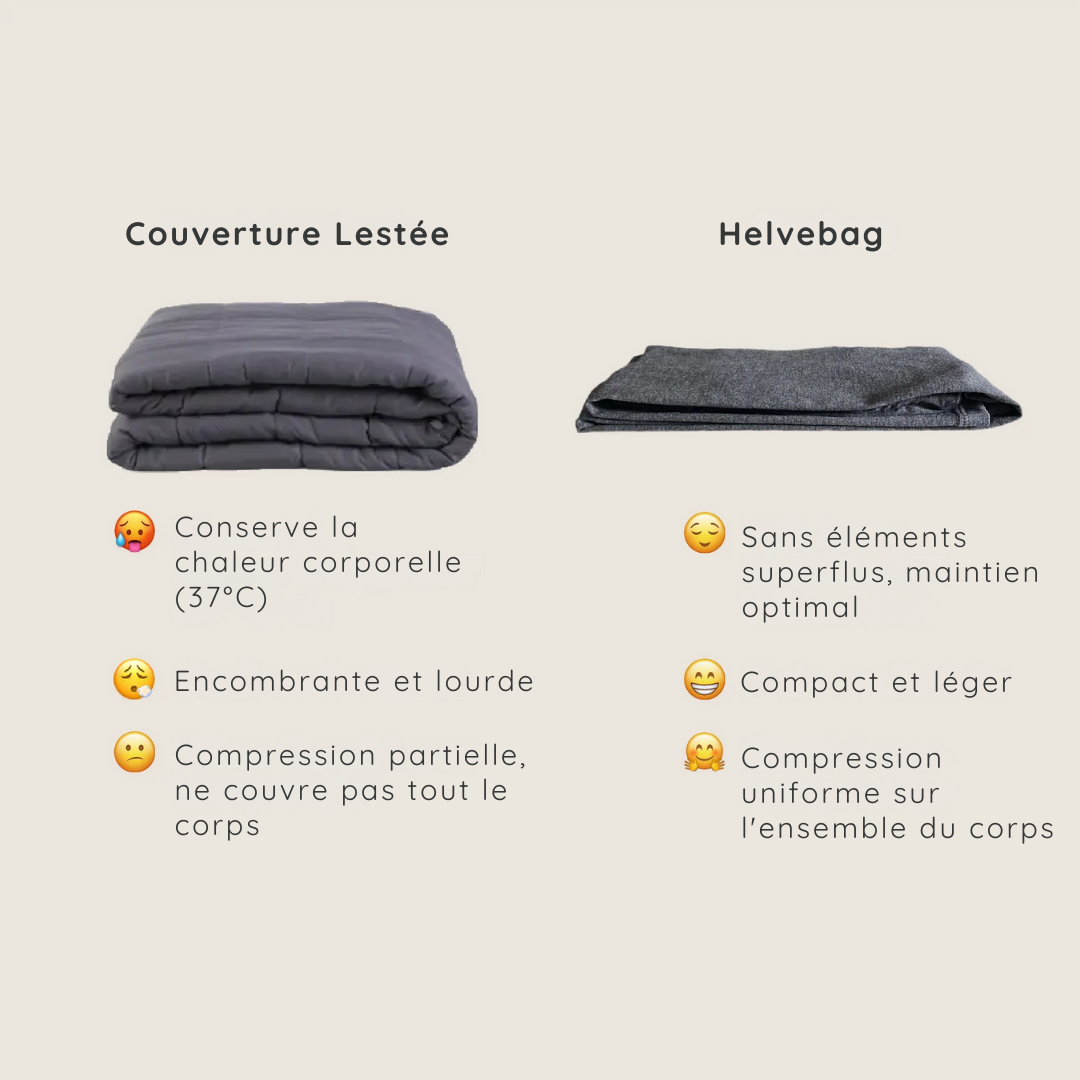 Le Helvebag ™ offre une sensation de calme grâce à la thérapie par pression profonde, enveloppant votre corps dans une housse apaisante qui améliore le sommeil et réduit le stress. C'est une alternative légère et respirante à la couverture lestée.