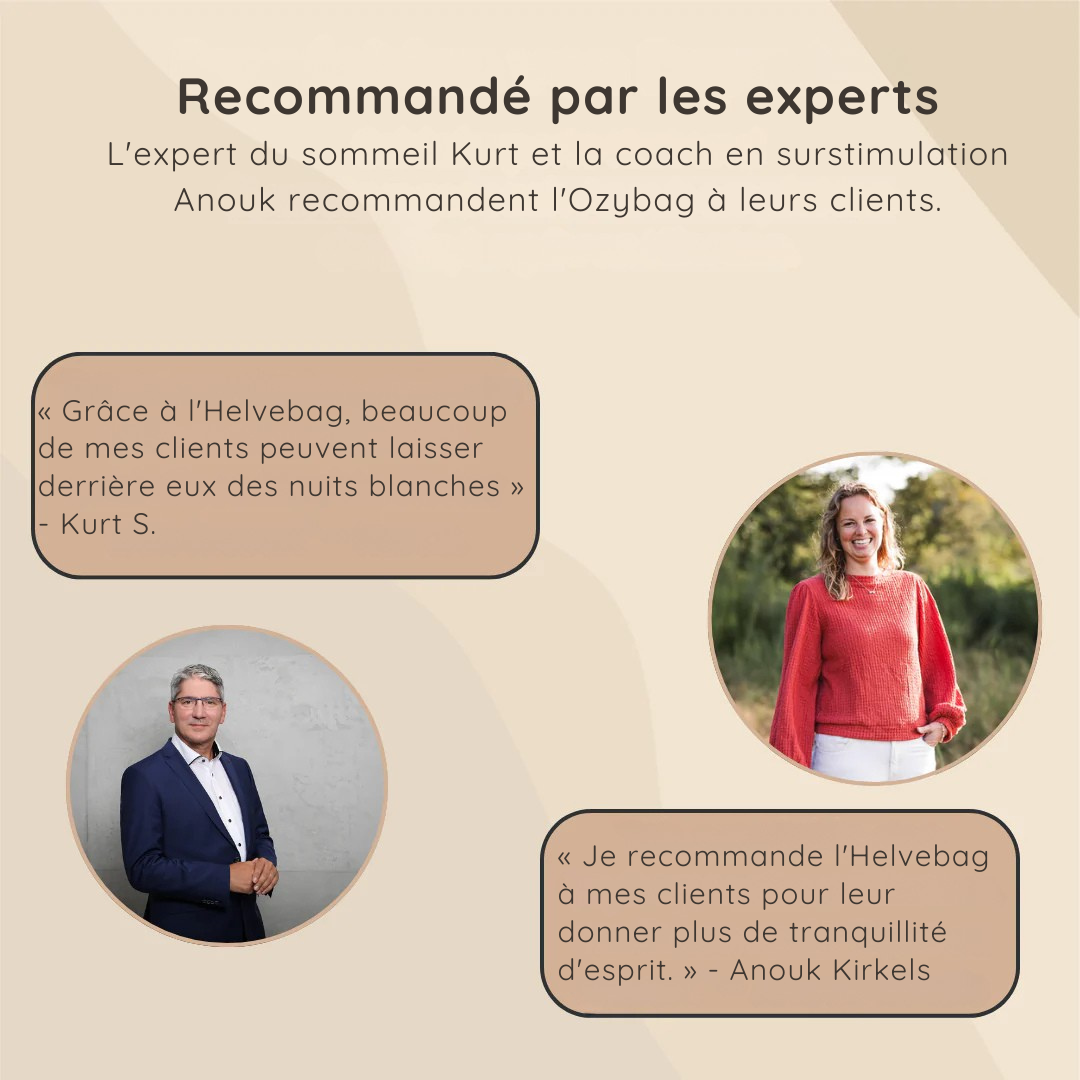 Helvebag™ est conçu pour favoriser un sommeil de qualité, mais il est également efficace pour réduire le stress, améliorer la concentration et offrir une sensation de calme lors de moments de détente ou de relaxation.
