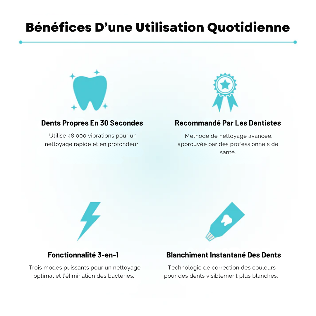 Oui ! HelveBrush™ nettoie toutes les dents en même temps grâce à ses vibrations haute fréquence (48 000/min). Vous obtenez un nettoyage uniforme, rapide et efficace — bien plus qu’une brosse classique.