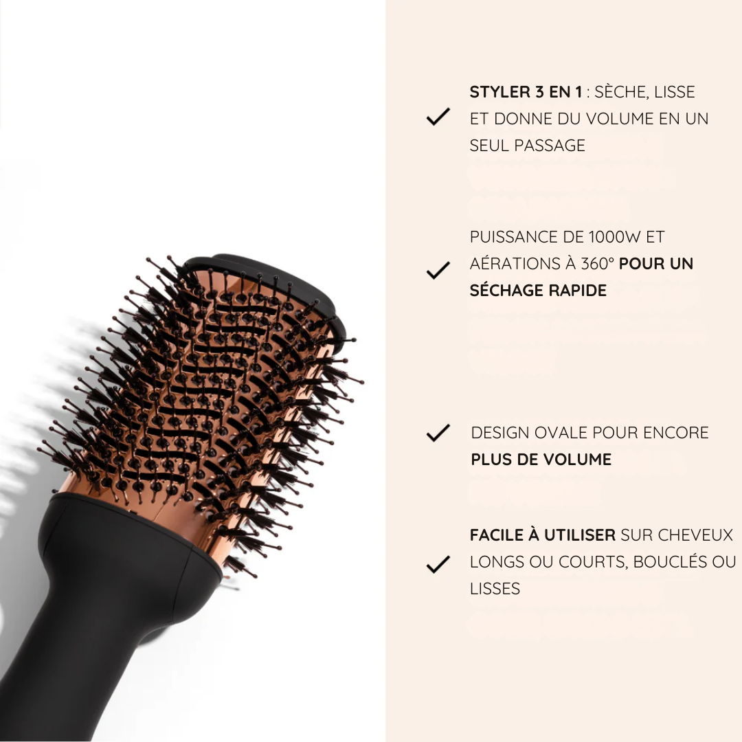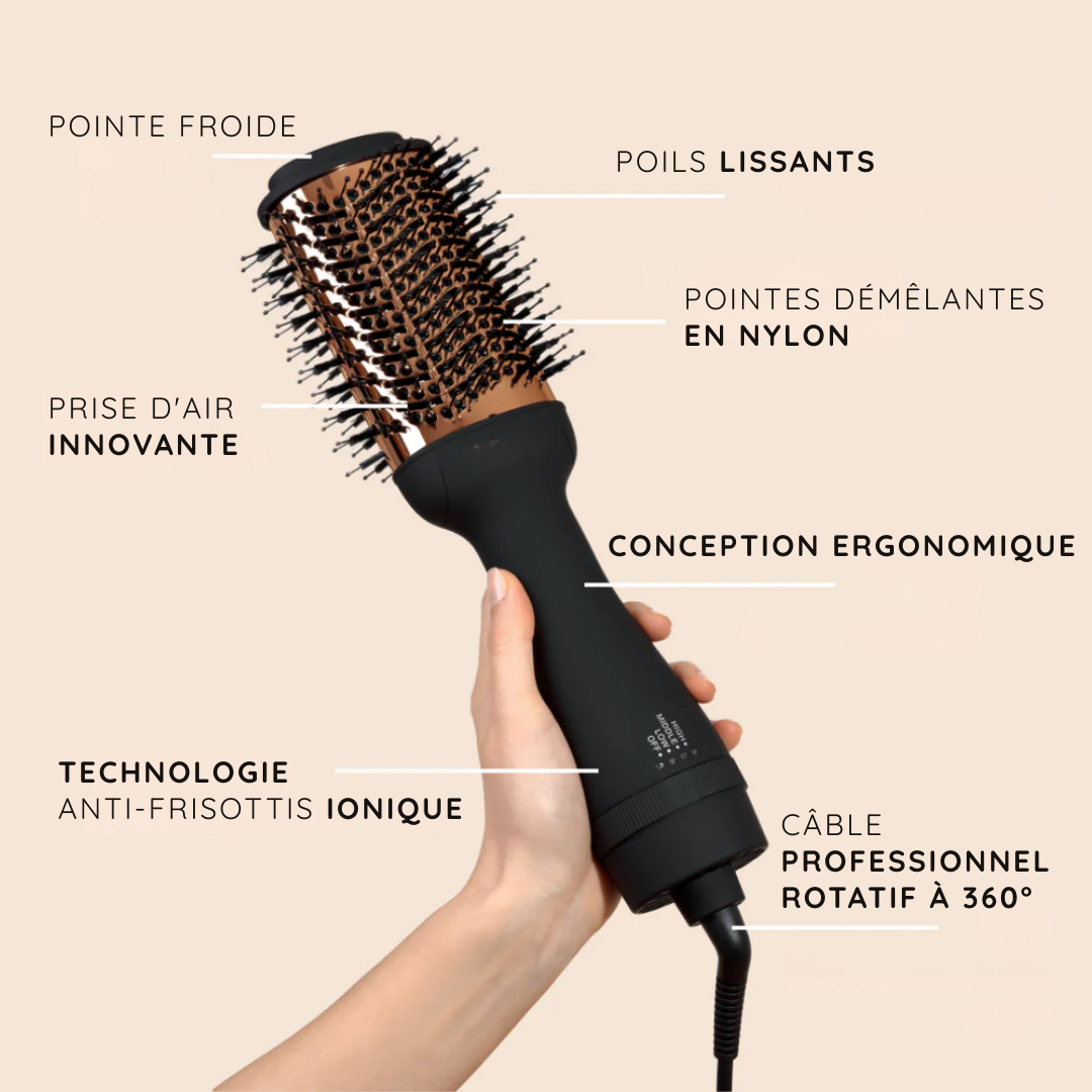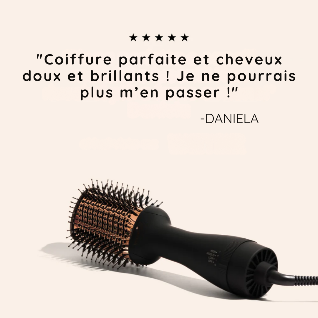 Pensée pour simplifier votre routine capillaire, HelveBrush™ remplace le duo sèche-cheveux + brosse traditionnelle pour un coiffage rapide, efficace et sans effort – tout en respectant vos cheveux.