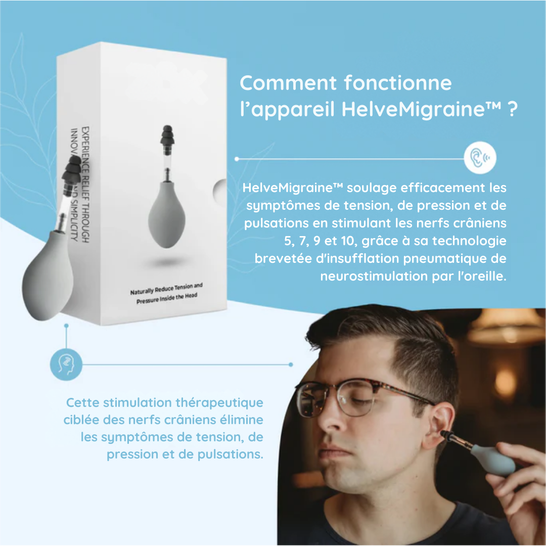 HelveMigraine™ utilise une stimulation pneumatique douce sur la membrane tympanique, activant les nerfs crâniens pour soulager instantanément les symptômes des migraines, tensions et pressions intracrâniennes.
