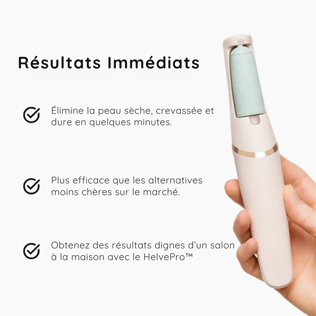 Pas besoin d'attendre des semaines pour voir la différence. HelvePro™ agit dès la première utilisation pour éliminer efficacement les callosités, la peau sèche et les rugosités, révélant une peau douce, lisse et agréable au toucher. Grâce à ses rouleaux exfoliants puissants mais sans danger, vous retrouvez des pieds soignés en quelques minutes — sans douleur, sans effort, sans sortir de chez vous. Un moment de soin simple, rapide et tellement satisfaisant, que vous aurez envie de l’utiliser encore et encore.