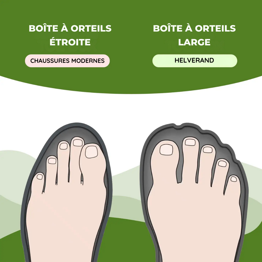 Contrairement aux chaussures modernes rigides qui compriment le pied, HelveRand™ respecte l’anatomie naturelle. Sa boîte à orteils élargie permet à vos pieds de s’étendre librement, améliorant ainsi l’équilibre, la posture et réduisant la pression sur les articulations. Idéale pour ceux qui marchent longtemps ou souffrent de douleurs plantaires, elle transforme chaque pas en un soulagement.