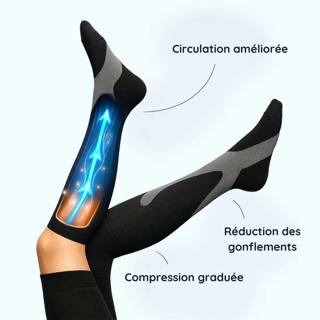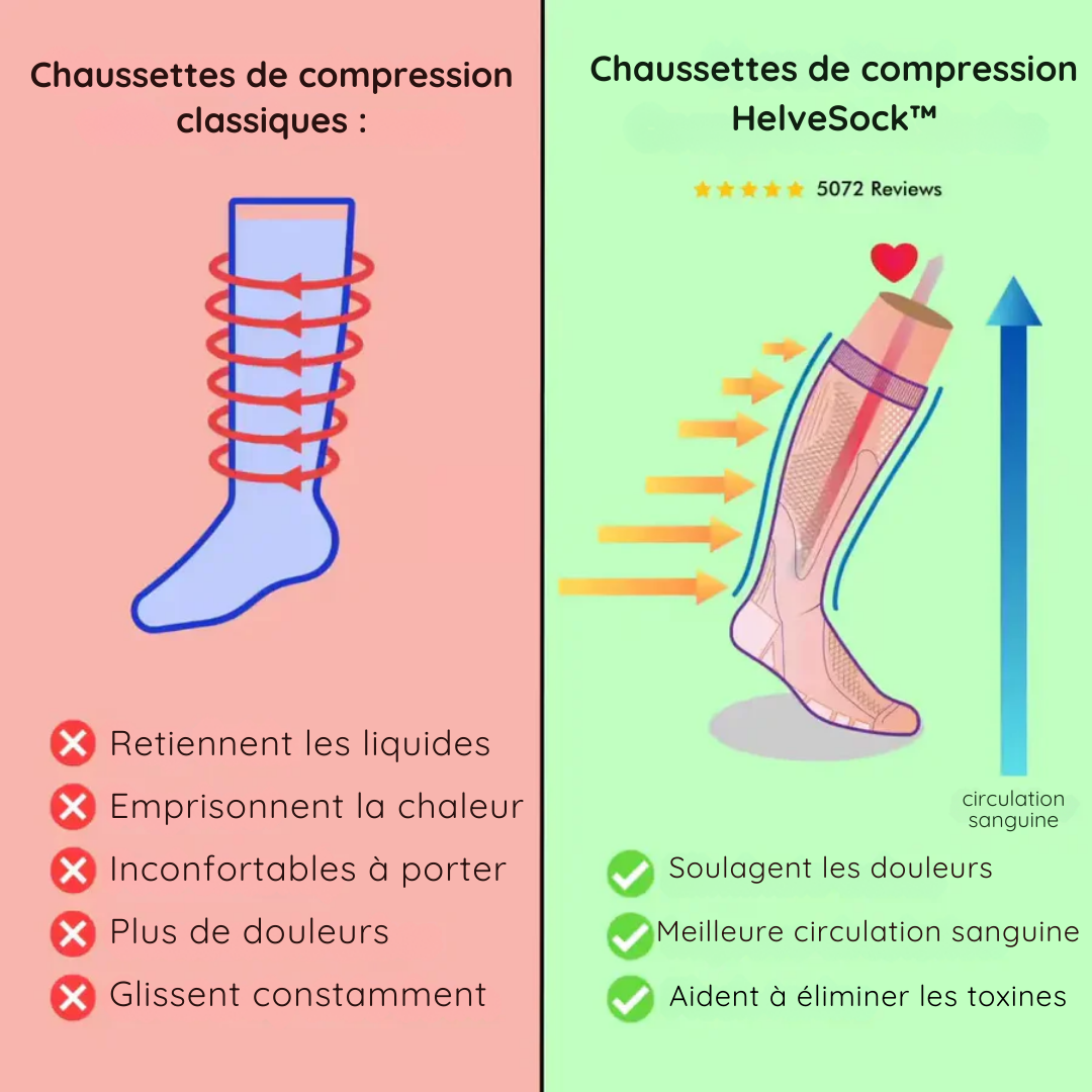 Idéales pour soulager les jambes lourdes, les douleurs chroniques et la mauvaise circulation, les chaussettes de compression HelveSock™ révolutionnent le confort au quotidien grâce à une technologie avancée de compression graduée.