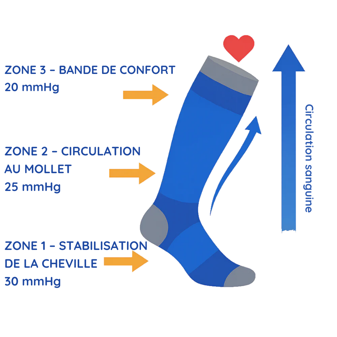 Contrairement aux chaussettes classiques qui compriment de manière uniforme (et inefficace), HelveSock™ utilise une compression graduée par zones : plus ferme à la cheville (30 mmHg), modérée au mollet (25 mmHg) et douce sous le genou (20 mmHg). Résultat ? Une meilleure circulation, moins de gonflements, et un confort incroyable du matin au soir. C’est cette technologie qui transforme chaque pas en soulagement actif.