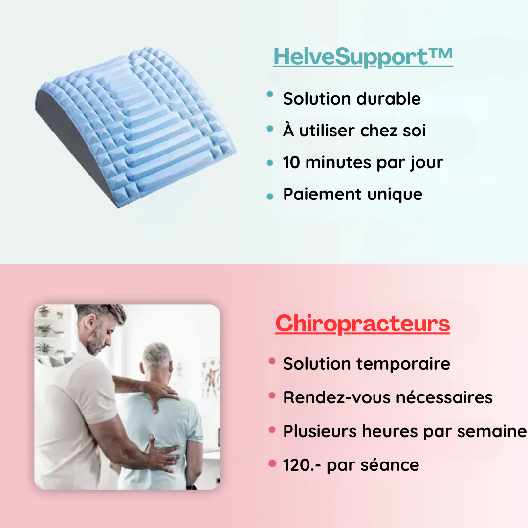 Discret, efficace et facile à utiliser, HelveSupport™ est la solution idéale pour soulager naturellement les douleurs dorsales, cervicales et sciatiques – sans médicaments, sans rendez-vous. Grâce à son angle d’étirement optimal de 26°, il détend la colonne, libère les tensions et restaure votre posture, depuis le confort de votre maison.
