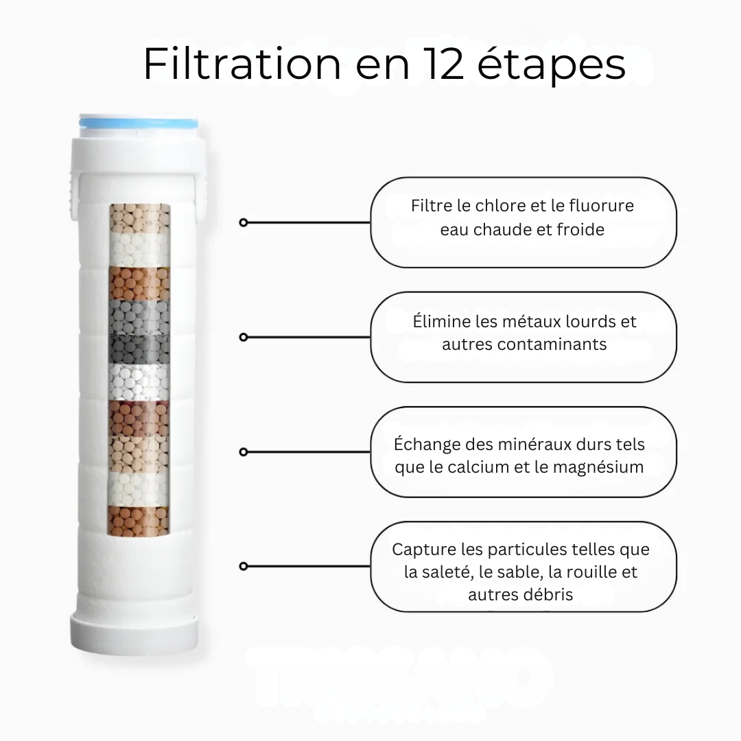 Le filtre élimine efficacement le calcaire, le chlore, et d'autres impuretés qui assèchent la peau et les cheveux.