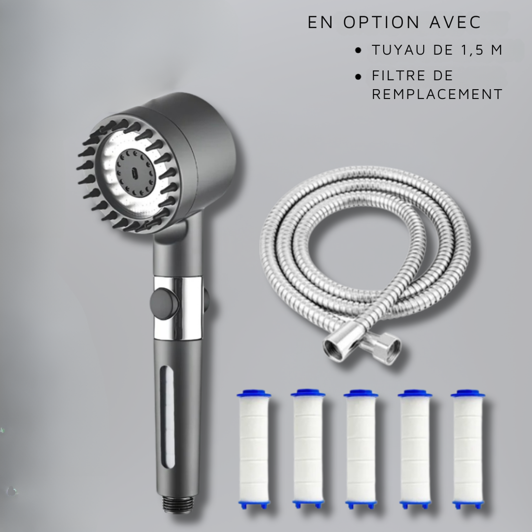 Hydro-Relax™ intègre un filtre "Clean-Water" révolutionnaire qui élimine efficacement le calcaire, le chlore, et les impuretés. Résultat ? Une peau douce et hydratée, des cheveux soyeux, et une réduction des irritations cutanées liées aux produits chimiques présents dans l’eau courante. Une vraie révolution pour votre bien-être quotidien.