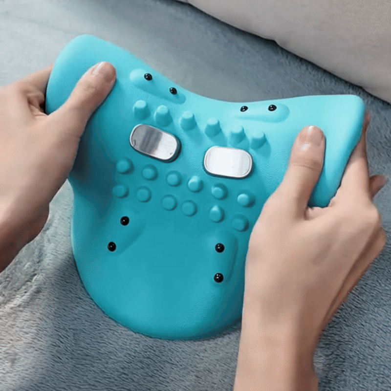 Le dispositif RelaxZen™ combine intelligemment traction cervicale, impulsions EMS, chaleur infrarouge et vibrations apaisantes pour soulager en profondeur les tensions musculaires du cou et des épaules.